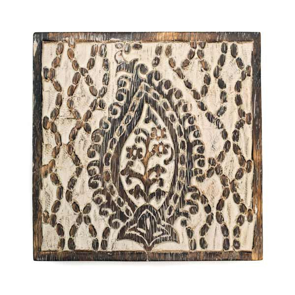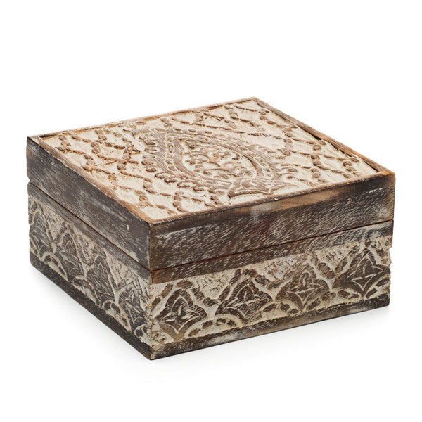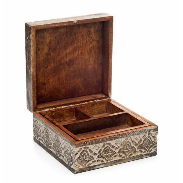 This mango wood jewelry box with hand engraved Indian motifs and white rub finish has the feel of an heirloom collected in the bustling markets of Delhi or Calcutta.