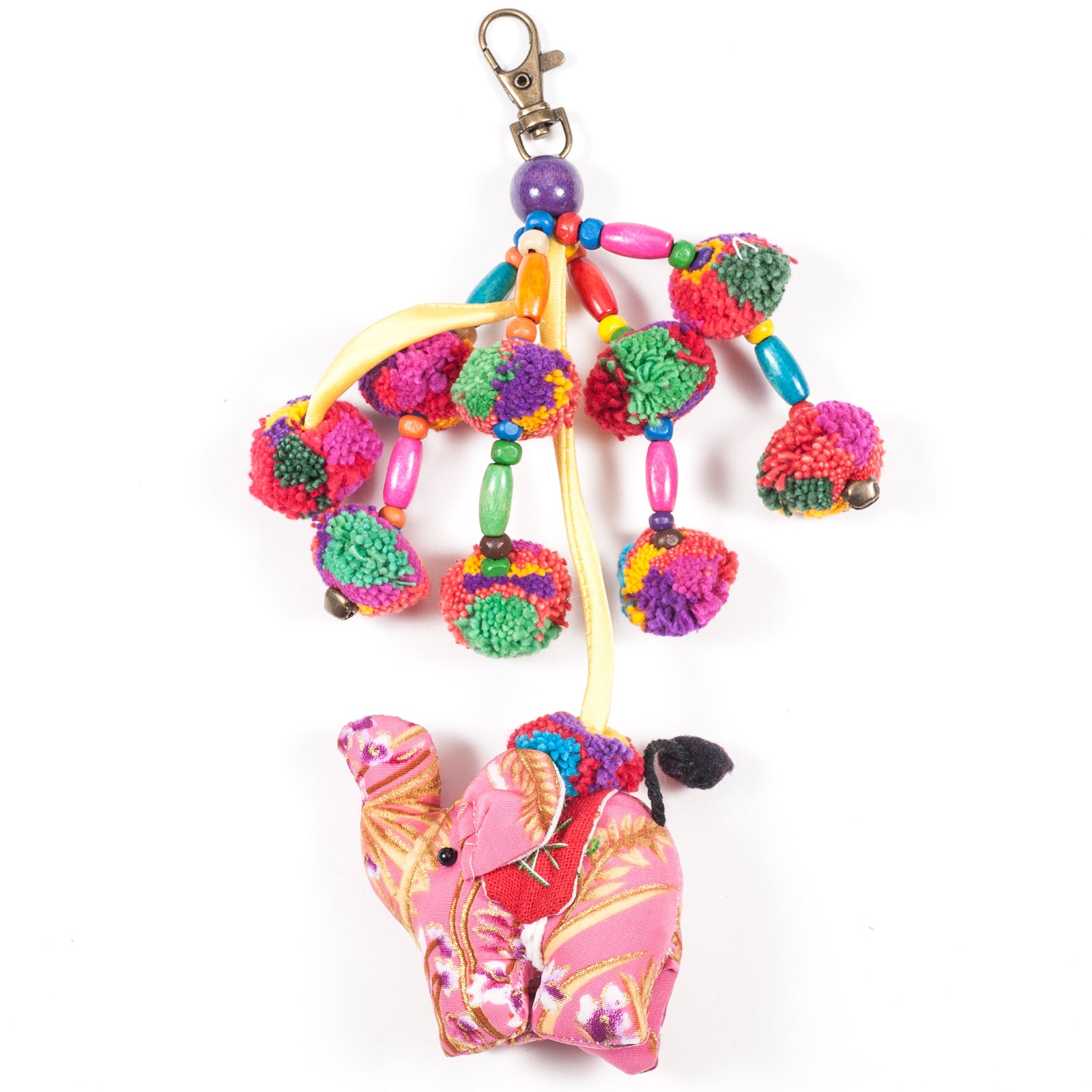 The whimsical elephant and pom-poms help enhance any bag, coin purse or keys.