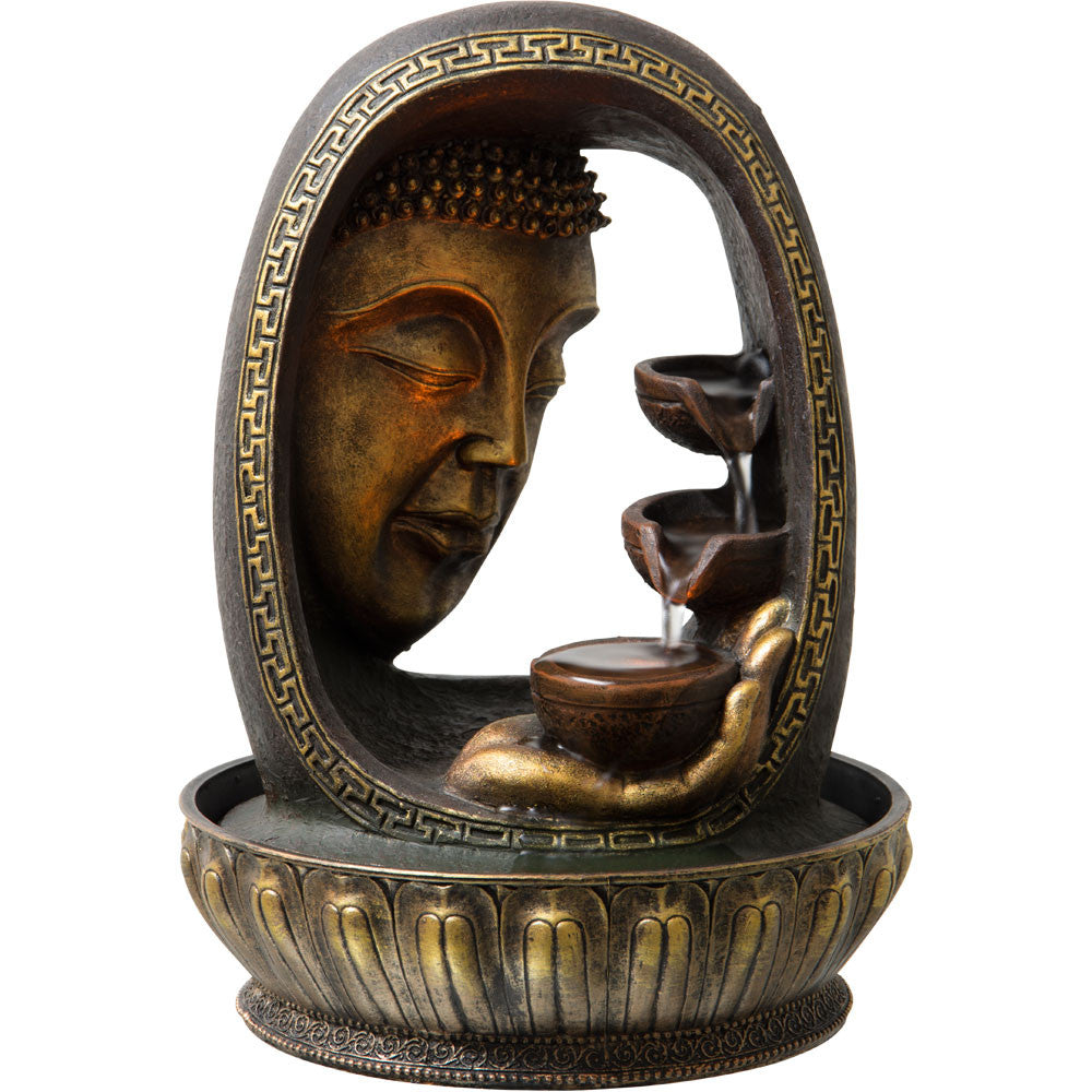 This stunning fountain features the tranquil face of the Buddha gazing down as his hand immerges from the water holding a bowl. Water gently flows down the wall from smaller bowls into the larger bowl atop Buddha’s hand and cascades into the Lotus basin below. A yellow light found in the largest bowl reflects a tranquil glow onto the Buddha face above. Includes UL electric cord, water pump and light.